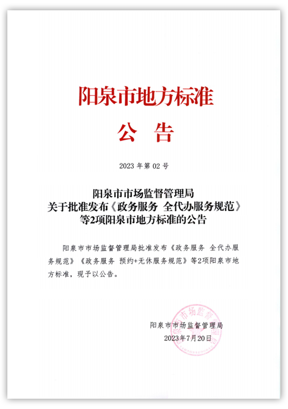 2023年7月20日,由麥斯達夫標準化服務(wù)(山西)有限公司、陽泉市郊區(qū)行政審批服務(wù)管理局共同研制的兩項陽泉市地方標準《政務(wù)服務(wù) 全代辦服務(wù)規(guī)范》《政務(wù)服務(wù) 預約+無休服務(wù)規(guī)范》正式獲批發(fā)布。