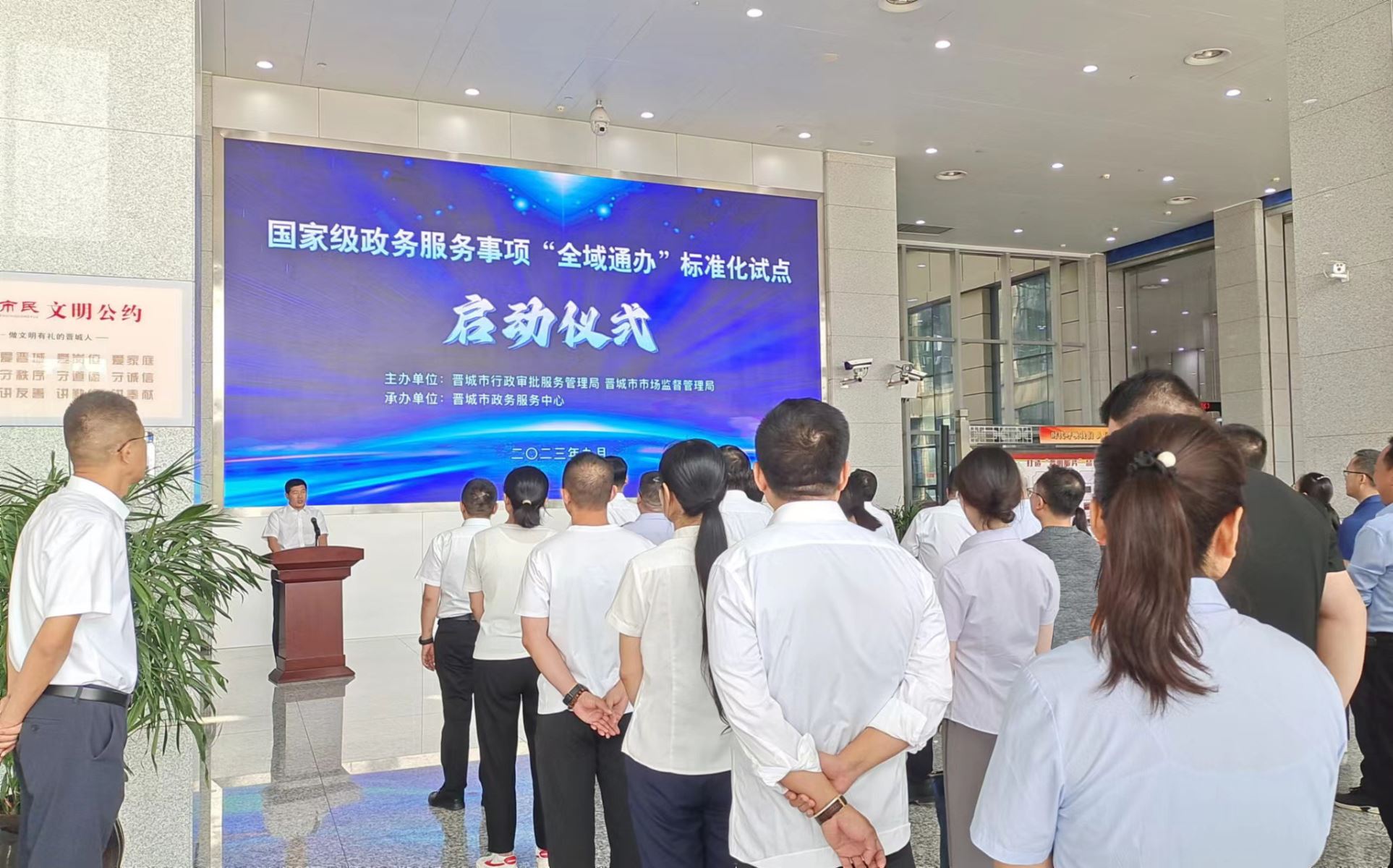2023年9月5日,山西晉城政務(wù)服務(wù)事項(xiàng)“全域通辦”標(biāo)準(zhǔn)化試點(diǎn)啟動(dòng)儀式在晉城市政務(wù)服務(wù)中心舉辦。市政府副秘書長,市行政審批服務(wù)管理局黨組書記、局長霍晉斌,市市場監(jiān)督管理局黨組書記、局長朱慧杰,市行政審批服務(wù)管理局黨組成員、市政務(wù)服務(wù)中心主任牛大偉,市市場監(jiān)督管理局三級(jí)調(diào)研員王勁等出席啟動(dòng)儀式,各縣(市、區(qū))行政審批局局長、市行政審批局各業(yè)務(wù)科室科長、市市場監(jiān)管局相關(guān)業(yè)務(wù)科室科長、入駐政務(wù)大廳窗口代表等近百人參加活動(dòng)。啟動(dòng)儀式由市行政審批服務(wù)管理局黨組成員、副局長秦文峰主持。