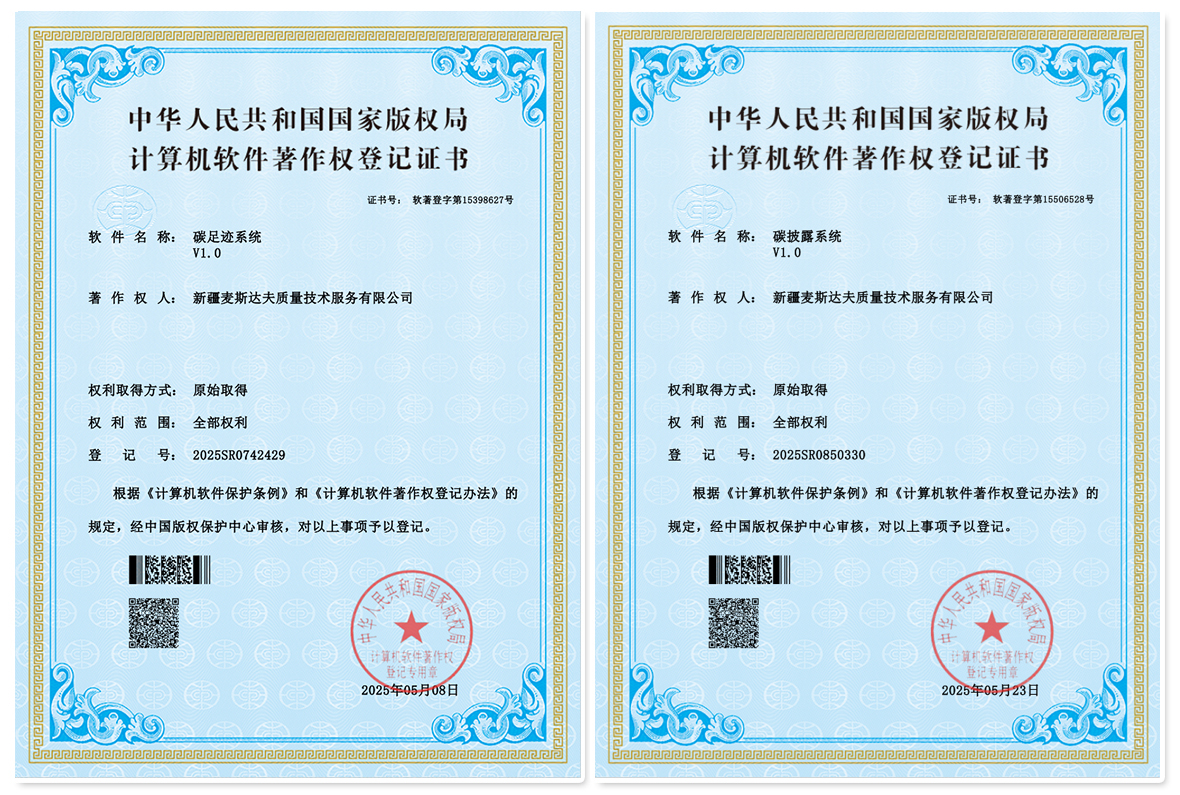 2025年4-5月,新疆麥斯達夫質量技術服務有限公司先后獲批碳監(jiān)測系統V1.0碳分析系統V1.0碳計量系統V1.0碳交易系統V1.0”“碳足跡系統V1.0碳披露系統V1.0等六項雙碳領域軟件著作權,實現雙碳技術服務全鏈條知識產權完整布局。