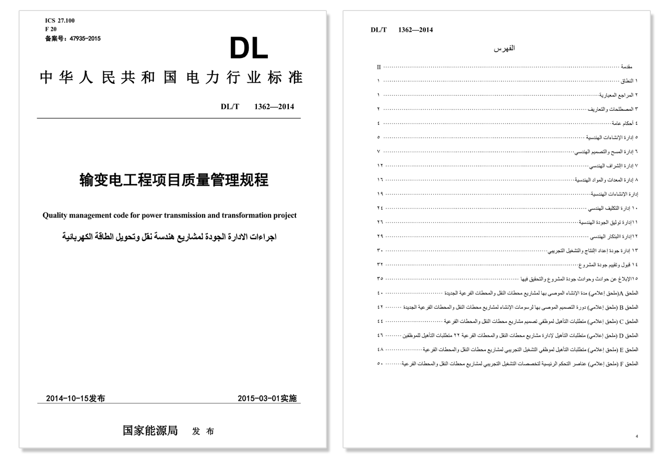 此次翻譯標準涵蓋輸變電、施工驗收、工程監(jiān)理、質量檢驗等關鍵領域,包括《輸變電工程項目質量管理規(guī)程》(DL/T 1362-2014)、《110kV~750kV架空輸電線路施工及驗收規(guī)范》(GB 50233-2014)等國家標準和行業(yè)標準。其中,《輸變電工程項目質量管理規(guī)程》(DL/T 1362-2014)阿拉伯語版本已率先完成翻譯并上傳至“一帶一路”推廣應用專欄,可登錄數據庫系統(tǒng)(http://dljs.mystuff.com.cn/index/promotion)查閱。其余9項標準目前正由專業(yè)團隊加緊翻譯,預計年內分批發(fā)布。