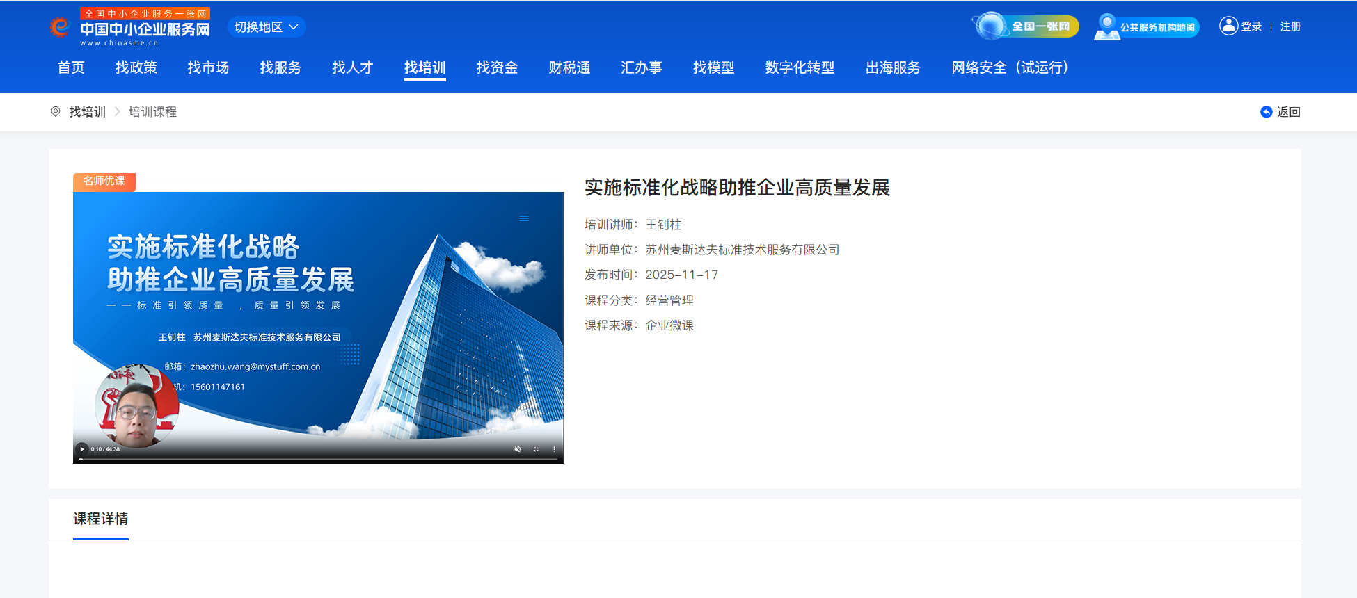 為貫徹落實(shí)黨中央、國(guó)務(wù)院關(guān)于促進(jìn)中小企業(yè)發(fā)展的決策部署,加強(qiáng)中小企業(yè)人才培訓(xùn)公共服務(wù),工業(yè)和信息化部組織開展了2025年中小企業(yè)人才培訓(xùn)“名師優(yōu)課”征集遴選工作。經(jīng)過(guò)社會(huì)征集、地方推薦、企業(yè)家評(píng)選及專家評(píng)審等多個(gè)環(huán)節(jié),遴選出100門優(yōu)質(zhì)課程。其中,麥斯達(dá)夫(蘇州)科技集團(tuán)有限公司總經(jīng)理王釗柱主講的《實(shí)施標(biāo)準(zhǔn)化戰(zhàn)略助推企業(yè)高質(zhì)量發(fā)展》課程成功入選,并成為本次唯一一門聚焦標(biāo)準(zhǔn)化領(lǐng)域的“名師優(yōu)課”。