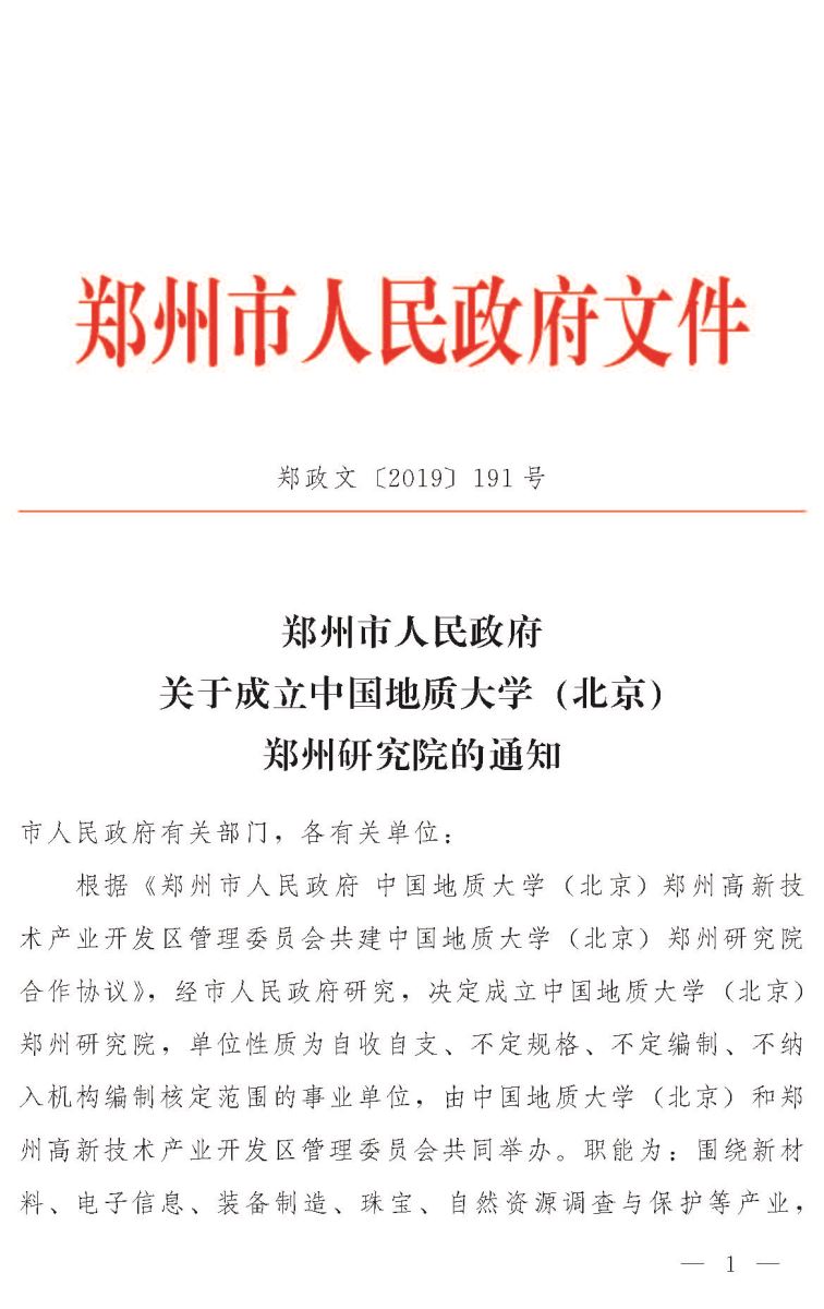 鄭州市人民政府關(guān)于成立中國地質(zhì)大學(xué) (北京)鄭州研究院的通知
