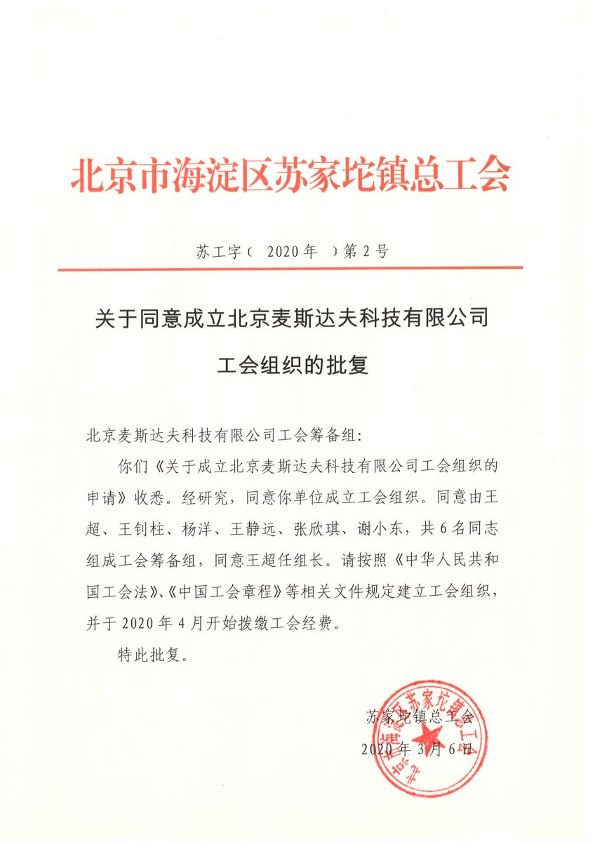 北京麥斯達夫科技有限公司工會獲組織同意批復