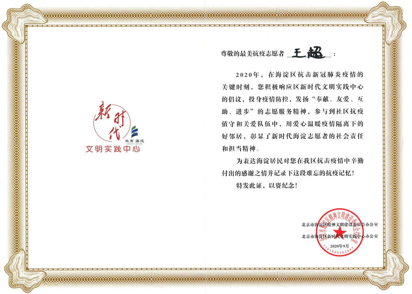 為深入貫徹習(xí)近平總書記關(guān)于堅(jiān)決打贏疫情防控阻擊戰(zhàn)的重要指示精神,進(jìn)一步關(guān)心激勵(lì)疫情防控人員,7月,海淀區(qū)新時(shí)代文明實(shí)踐中心開(kāi)啟了第二批"最美抗疫志愿者"征集活動(dòng),經(jīng)過(guò)廣大人民群眾的推選點(diǎn)贊,共產(chǎn)生674位“最美抗疫志愿者”。麥斯達(dá)夫“標(biāo)兵共產(chǎn)黨員服務(wù)隊(duì)”隊(duì)員王超、謝小東、陳達(dá)獲評(píng)海淀區(qū)“最美抗疫志愿者”榮譽(yù)稱號(hào)。