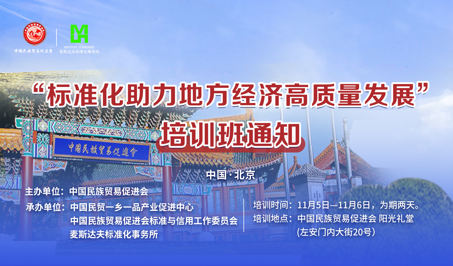 為進(jìn)一步提升中國(guó)一鄉(xiāng)一品標(biāo)準(zhǔn)化品牌價(jià)值,順利推動(dòng)標(biāo)準(zhǔn)化工作的落地,有效服務(wù)一鄉(xiāng)一品特色產(chǎn)業(yè)質(zhì)量提升,中國(guó)民族貿(mào)易促進(jìn)會(huì)決定舉辦“標(biāo)準(zhǔn)化助力地方經(jīng)濟(jì)高質(zhì)量發(fā)展”培訓(xùn)班。現(xiàn)將有關(guān)事宜通知如下:
