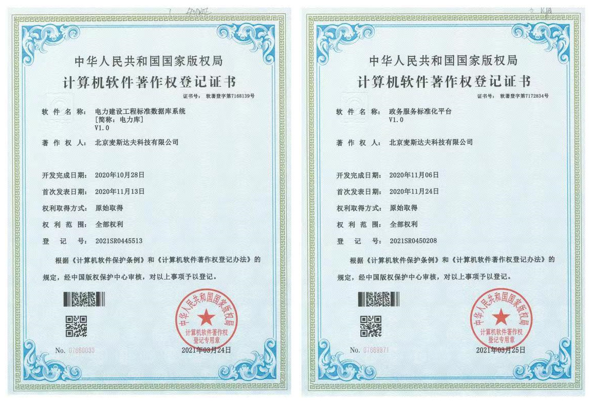 2021年4月8日,北京麥斯達(dá)夫科技有限公司獲得兩項(xiàng)軟件著作權(quán)證書,“電力建設(shè)工程標(biāo)準(zhǔn)數(shù)據(jù)庫系統(tǒng)”和“政務(wù)服務(wù)標(biāo)準(zhǔn)化平臺(tái)”。