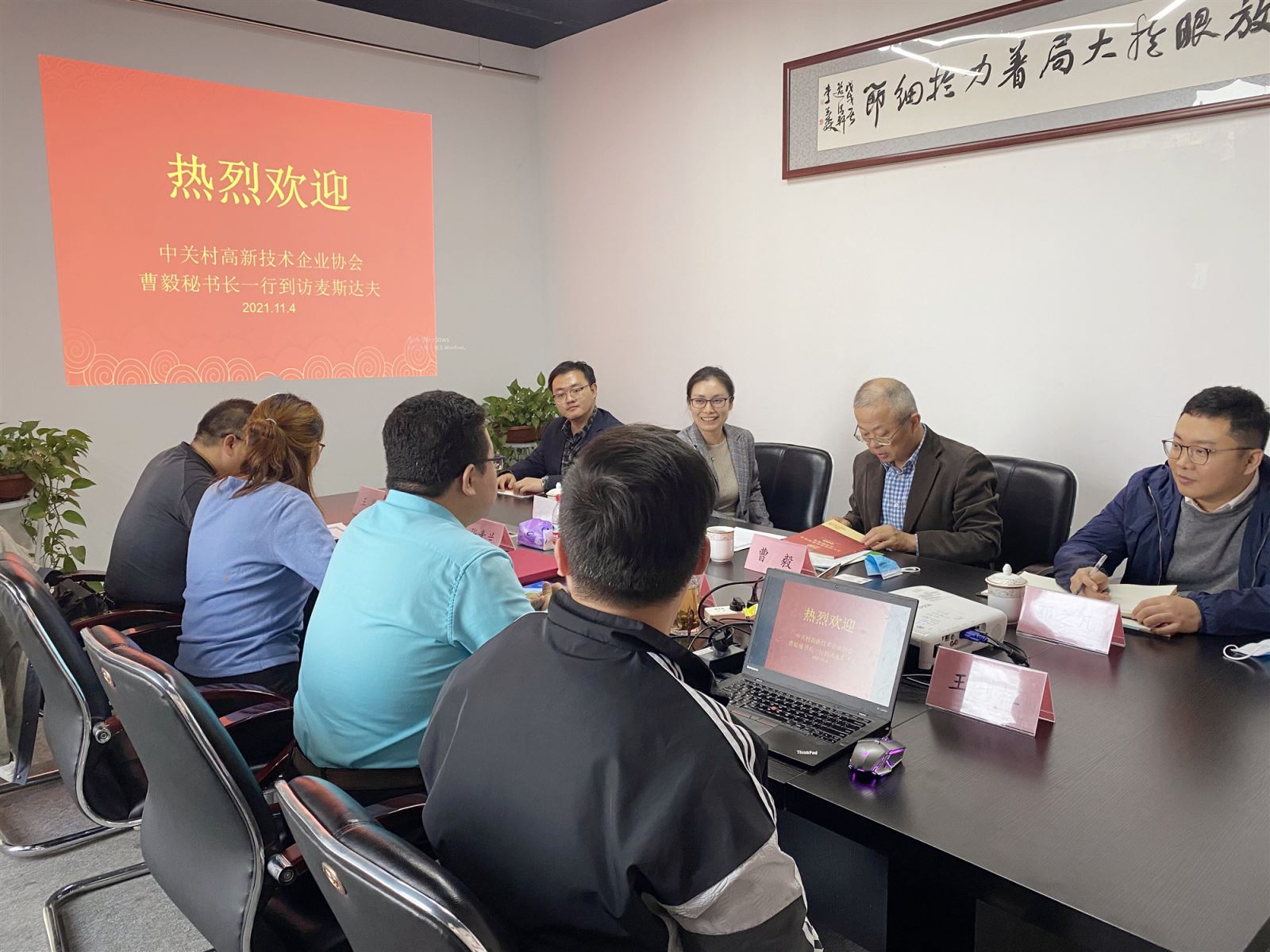 2021年11月4日,中關(guān)村高新技術(shù)企業(yè)協(xié)會(huì)常務(wù)副會(huì)長(zhǎng)、秘書長(zhǎng)曹毅,秘書長(zhǎng)助理郭佳、鄧之凡,科技服務(wù)專委會(huì)工作組李萬(wàn)鵬一行蒞臨交流。麥斯達(dá)夫首席執(zhí)行官鄭波、市場(chǎng)總監(jiān)王釗柱、財(cái)務(wù)經(jīng)理張素蘭參加會(huì)見。