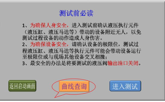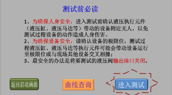 3、確認(rèn)現(xiàn)場人員和設(shè)備安全后,點(diǎn)擊“進(jìn)入測試”,進(jìn)入液壓閥測試類型選擇畫面;
