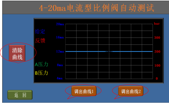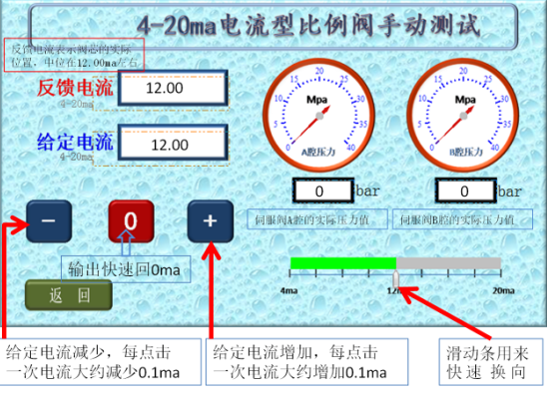 6、比例閥正常時(shí)的表現(xiàn)為:a、給定電流12.00ma時(shí),反饋電流在12.00ma,比例閥輸出的A、B腔壓力相同;b、用滑動(dòng)條可迅速換向,反饋電流改變且A、B腔壓力差較大;c、點(diǎn)擊增加按鈕,反饋電流逐漸增加且A、B腔壓力差逐漸增大;d、點(diǎn)擊減少按鈕,反饋電流逐漸減少且A、B腔壓力差逐漸減少,過12.00ma后比例閥會(huì)換向;